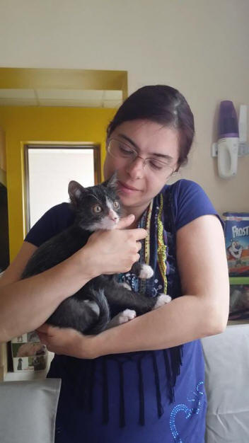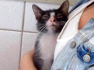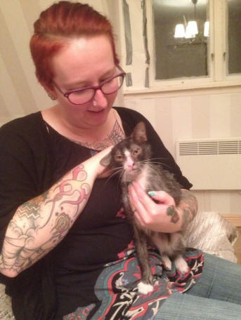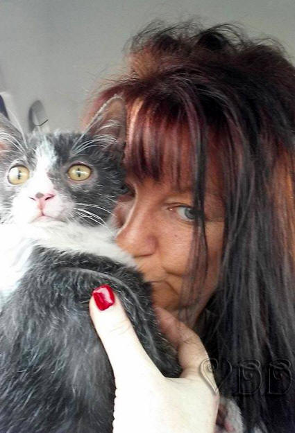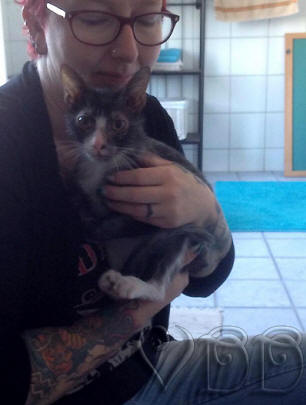 Choupi Romulus en route vers sa nouvelle maison et avec Bridget sa nouvelle maman. Romulus sera le premier Lykoi en Belgique.