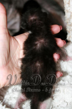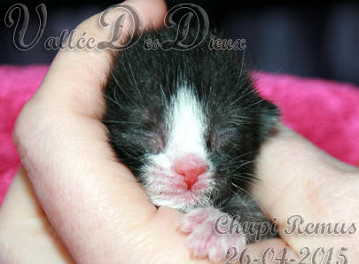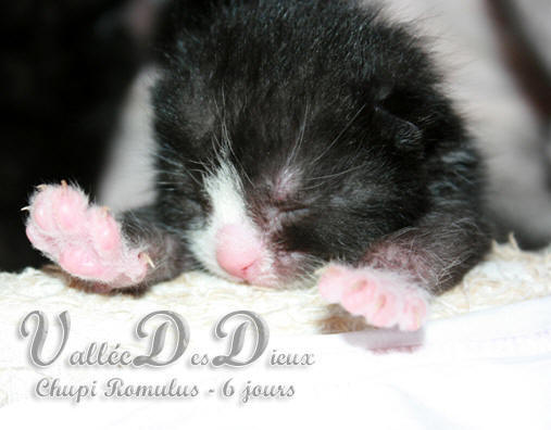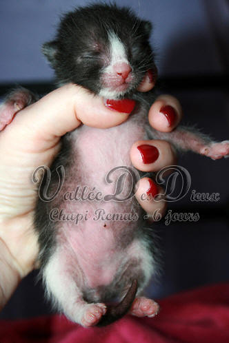 "ValleeDesDieux Thanks Fiammetta" dite Fiamma "ValleeDesDieux Chupi Remus" dit Remus & "ValleeDesDieux Chupie Romulus" dit Romulus Leur petite bouille à la naissance. Vous pouvez constater que les Lykois Cats naissent complètement poilus comme tout autre chaton.